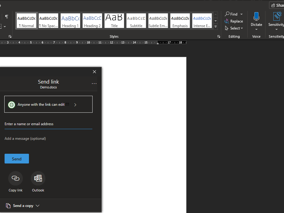 | If the document is stored in OneDrive Personal, OneDrive for Business or in a SharePoint Online Document Library, it can be shared. The standard dialog is called up. |
