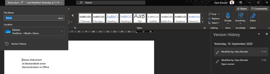 Office knows more than we can remember. But in the past there were error messages when opening a document like "Sorry, we couldn’t find your file. Has it been moved, renamed or deleted?" Yes, right. Office could not know that I renamed this document in Windows Explorer. Yes, if I had saved the file at the very beginning in a location that is synchronized with the cloud, the manual search would not have occurred at all when I recalled it. Because in all SharePoint libraries and in OneDrive for Business, the version history works. Renaming in Windows Explorer or in the web browser creates an additional version. Everything is logged in a fine and clean manner. And if I select a file with the old name while opening it, the file with the new name is opened and the list is updated. So the above error message is a thing of the past.