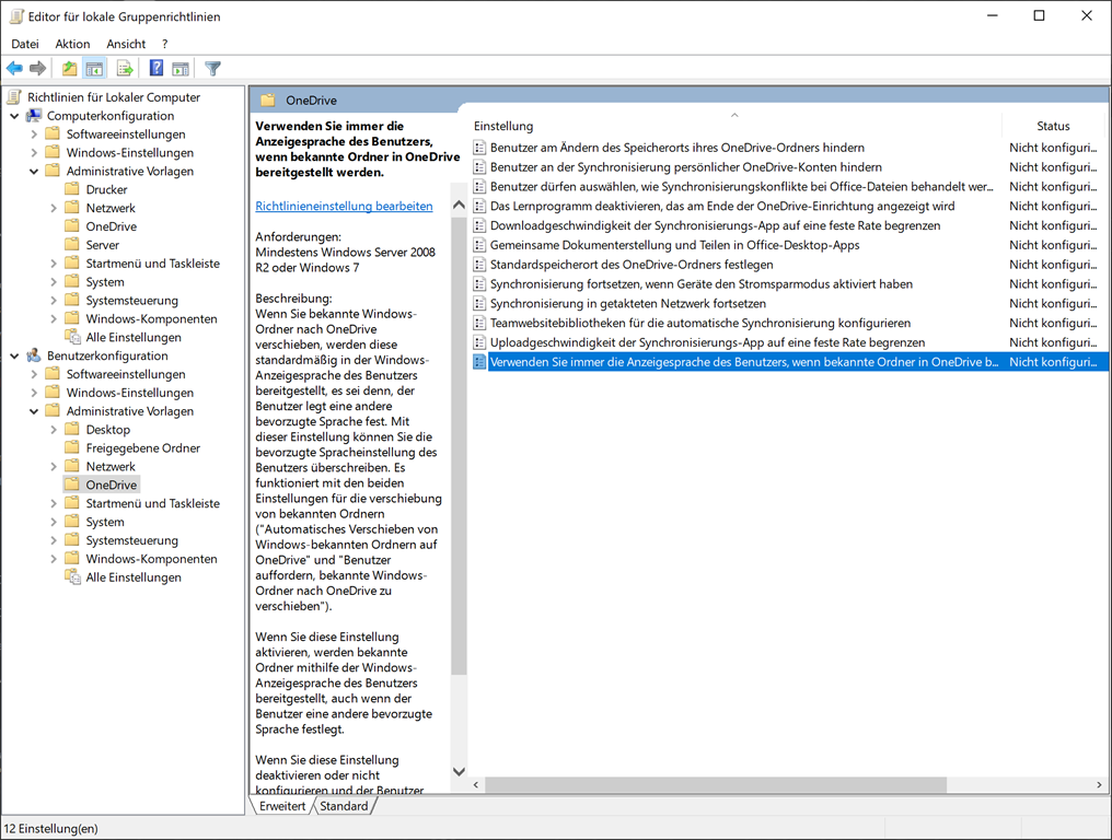 Verwenden Sie immer die Anzeigesprache des Benutzers, wenn bekannte Ordner in OneDrive bereitgestellt werden