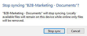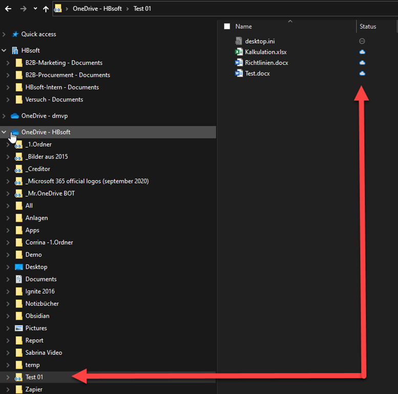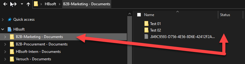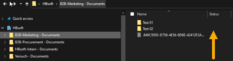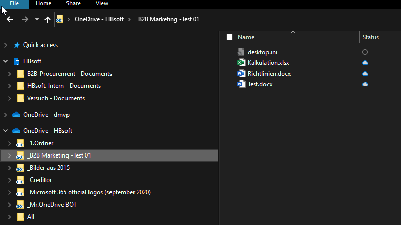 This is about the SharePoint Online document library B2B-Marketing. The icon next to the folder indicates that the files are in the cloud. Only with the displays Microsoft still has its problems, because a file actually shows in the folder the display „locally available“. The only important thing is that we have an icon at all. No matter if it shows locally available, always available, only available in the cloud or in synchronization. It means that changes synchronize in both directions. (Icons)