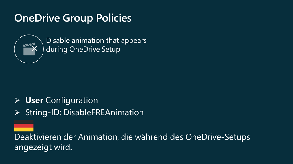 Für den Benutzer gibt es jetzt eine neue Richtlinie mit dem Namen Deaktivieren der Animation, die während des OneDrive-Setups angezeigt wird ![]()