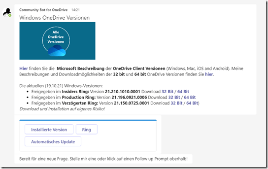 Das ist eine Möglichkeit. Aber auch der Community-Bot for OneDrive kennt die aktuellen Windows OneDrive Versionen: Einfach Windows OneDrive Versionen eingeben. Der Bot zeigt dann folgendes Ergebnis an: