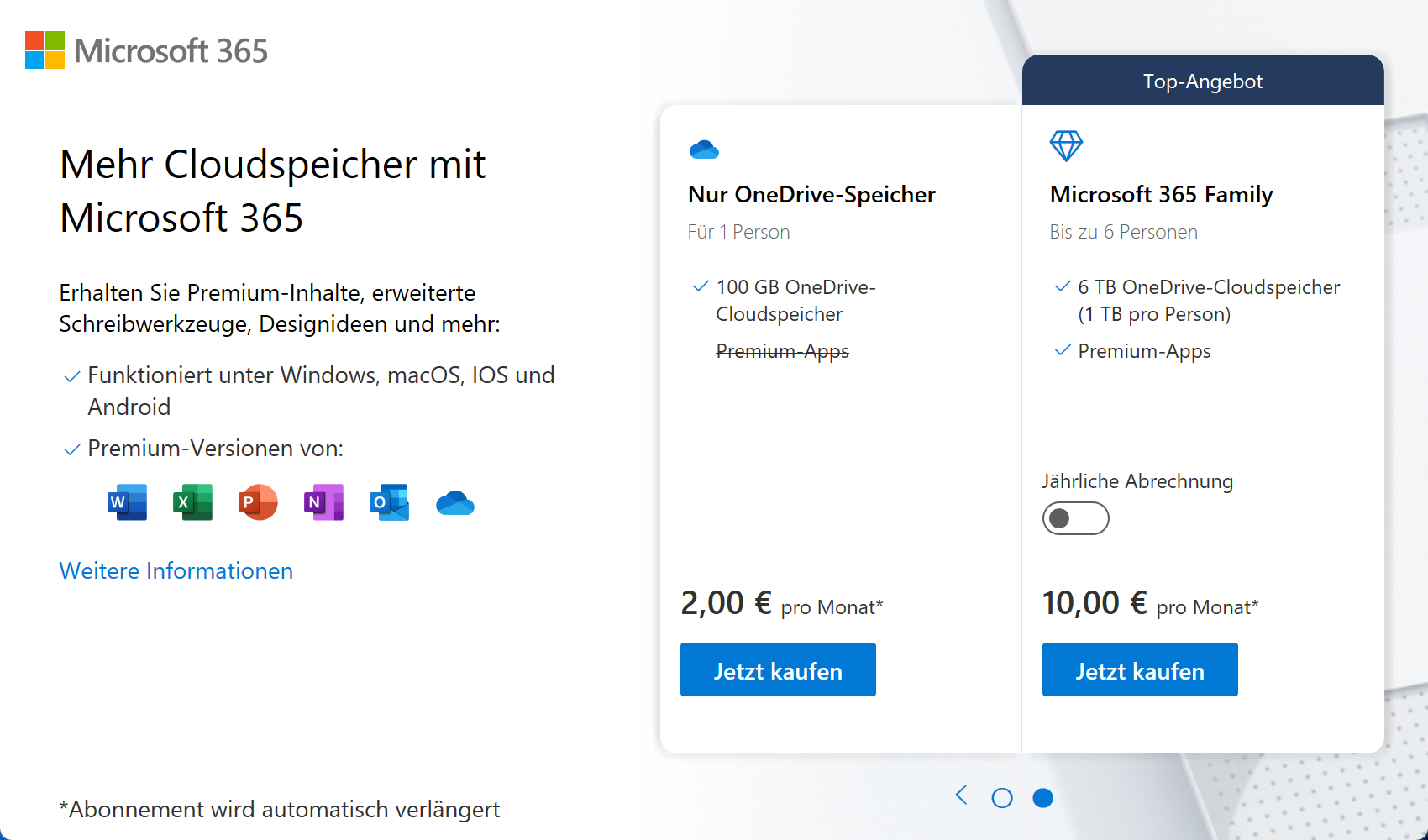 Hinter dem Button Speicher erweitern verbirgt sich Microsoft Werbung. Oder aber die Möglichkeit, mit ein paar Klicks zusätzlichen Speicher oder gar eine Einzel- oder Familien Lizenz zu erwerben.