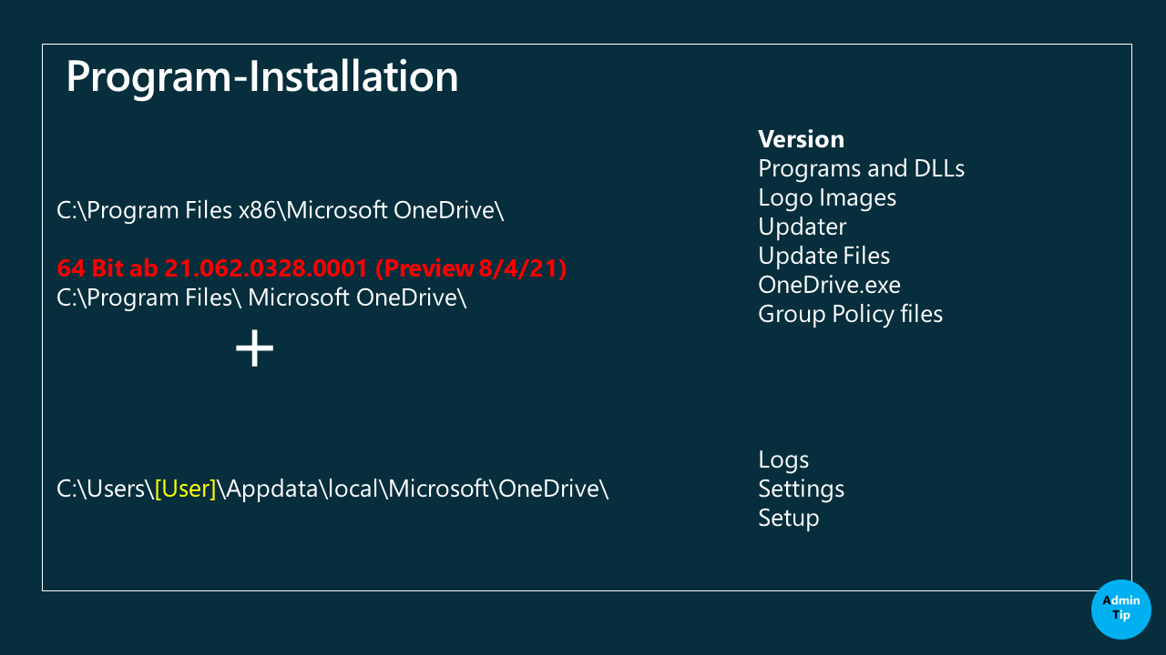 Es hat leider etwas länger gedauert. Im August 2021 angekündigt. Aber bevor wir dazu kommen, ein paar Kleinigkeiten, die bei OneDrive anders sind. Die aktuellen Gruppenrichtlinien können nicht bei Microsoft heruntergeladen werden, sondern mit jedem Update werden auch die Gruppenrichtlinien mitgeliefert. Und das in 17 Sprachen. Dazu müssen wir zuerst einmal wissen, wo OneDrive gespeichert ist. Das kann an 3 verschiedenen Orten sein: