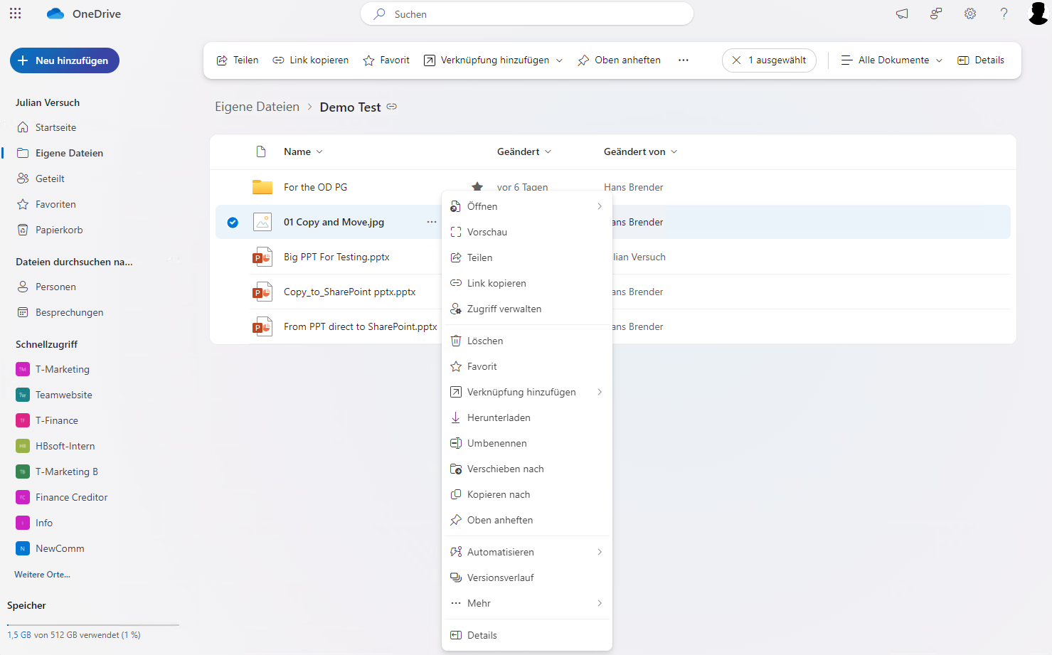 Ich arbeite meistens im Browser. Dabei identifiziere ich eine Datei, für die keine Browser basierende App zur Verfügung steht. Bisher musste ich den Browser verlassen, im Explorer (Windows) oder Finder (Mac) die Datei suchen und dann dort die Bearbeitung ausführen. Jetzt wird das Context-Menü im Browser (rechte Maustaste) bemüht und auf „In App öffnen“ geklickt. Dann wird unmittelbar die auf dem Gerät installierte Applikation gestartet und die selektierte Datei in die Applikation geladen. Nach dem Bearbeiten beendet man die Applikation, und die Datei wird in die Cloud synchronisiert.