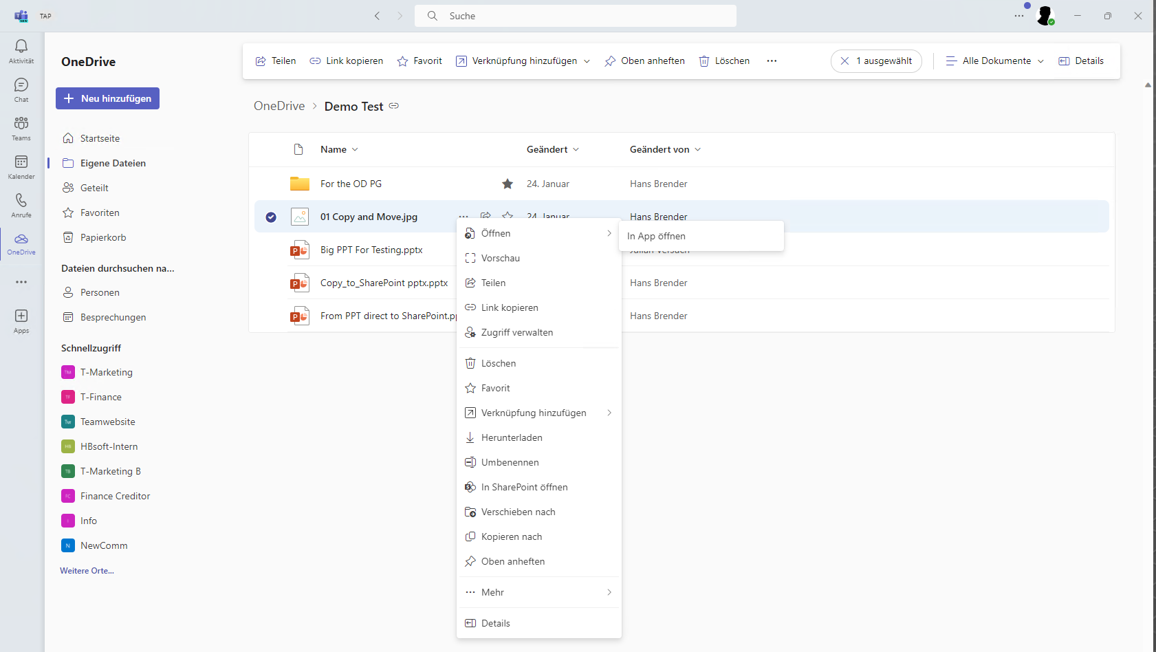 In App öffnen funktioniert in SharePoint und Teams (Dateien) nur über das Kontextmenü „In App“ öffnen. Dies standardmäßig zu aktivieren ist (noch) nicht möglich.