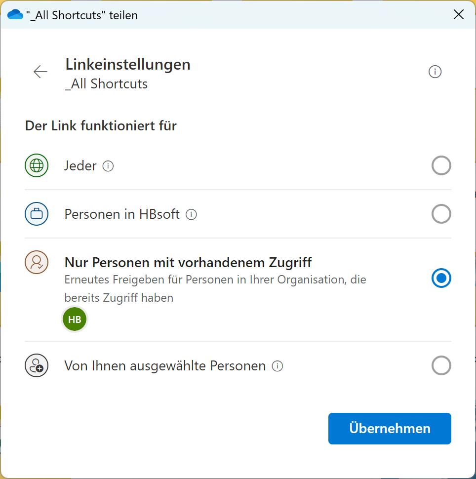 Die Administratoren wünschten sich die gleiche Logik für Links in der eigenen Organisation und für das externe Teilen an externe Personen, die den Link aber nicht weiterleiten können.