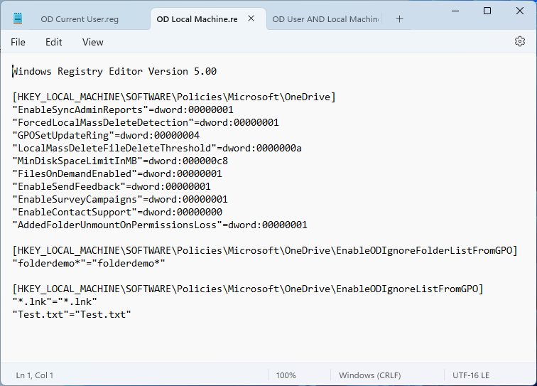 You can combine both files to save time later when importing. To do this, copy the header from (1) and then the contents of (2) and (3) into a new file (see Figure 14) and save the new file: OD User AND Local Machine.reg